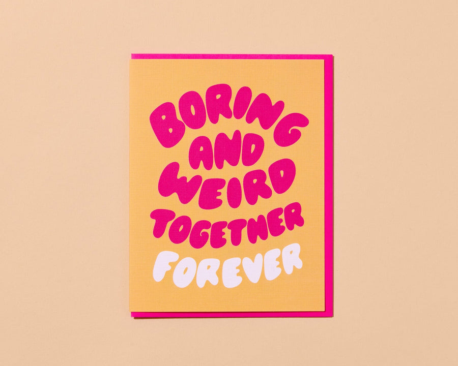 Card reads, "Boring and Weird Together Forever"