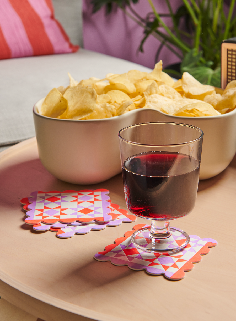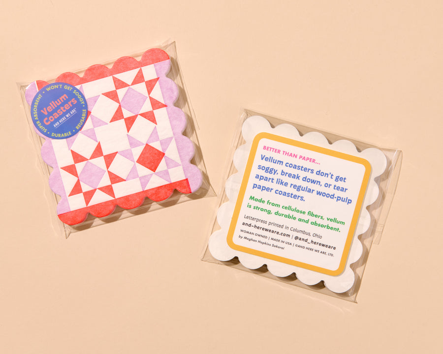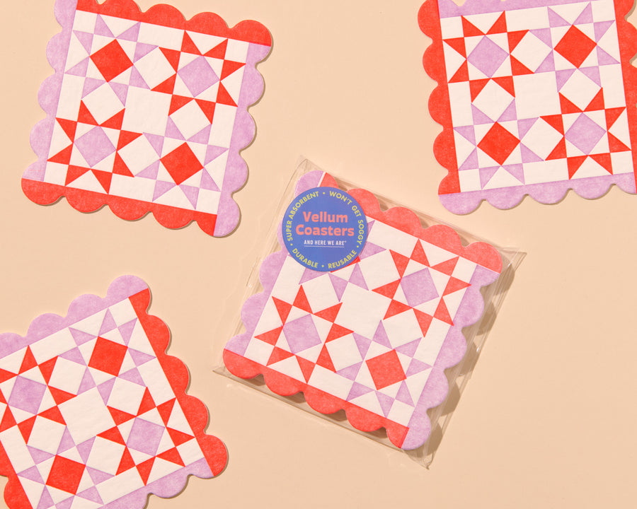 Mod Quilt Scalloped Vellum Coasters - Red/Lilac (Set of 4) letterpress printed vellum coasters