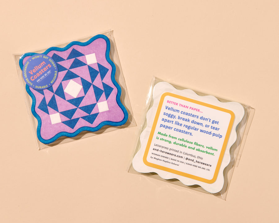 With a wavy edge and on-trend colors, you'll set your table in style with these hand printed coasters. Set of 4 coasters, letterpress printed onto durable & absorbent vellum.